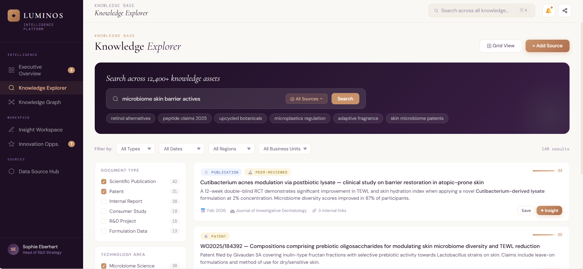 Knowledge Connect is a premium innovation intelligence platform that helps a global beauty and cosmetics team unify internal knowledge with external signals in one workspace.