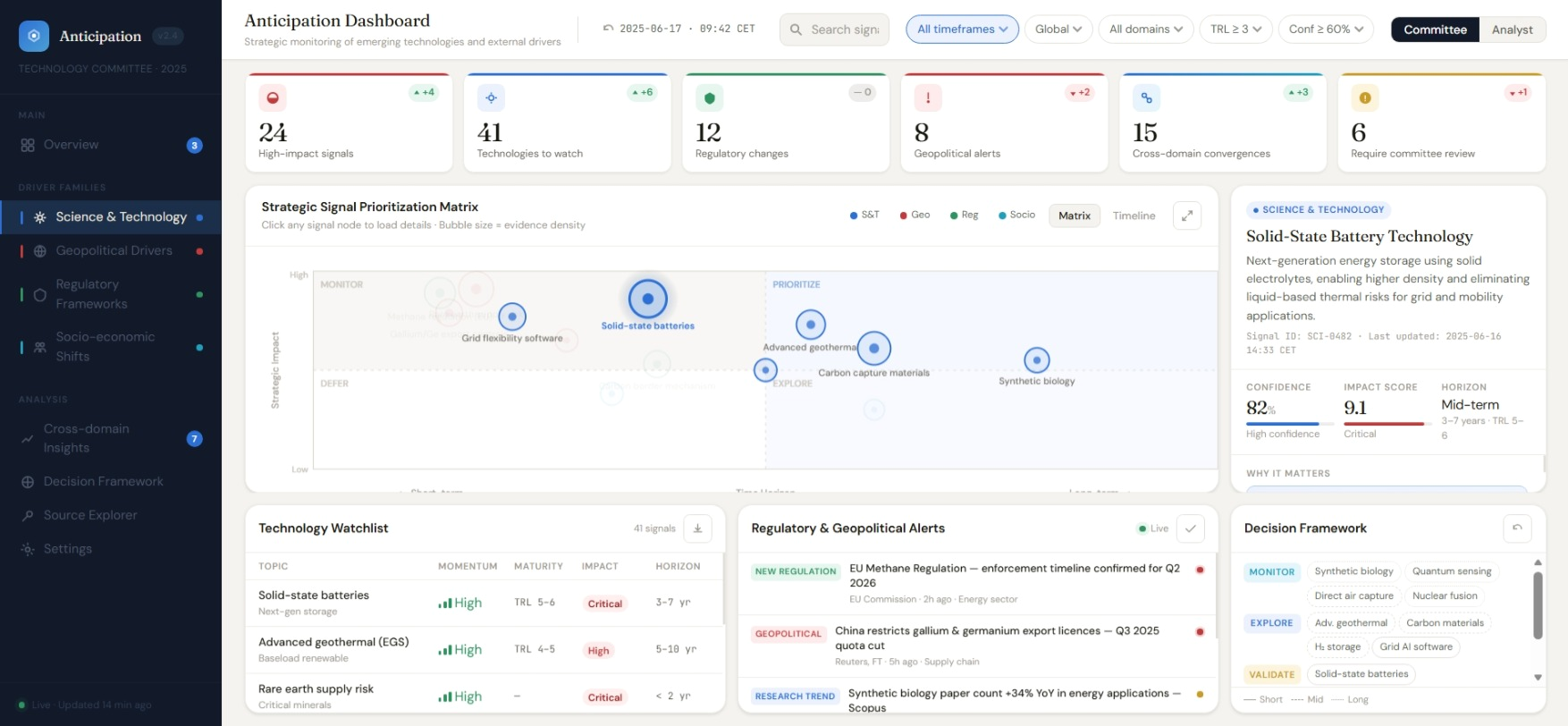 The Anticipation Dashboard is an automated PESTEL(*)-based intelligence system that continuously monitors the key drivers shaping your business environment. It detects, interprets, and prioritizes emerging trends and early signals before they become urgent or disruptive.