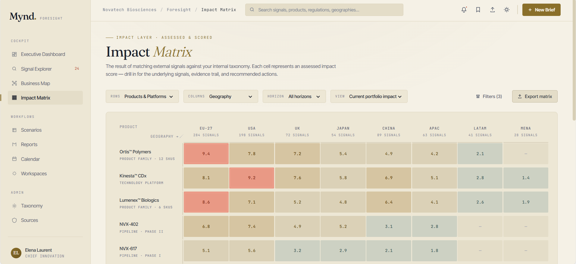 It matches those external signals with the internal knowledge base of our client covering the client’s products, technology platforms and pipeline developments. By doing so, the platform helps teams identify where potential impact may emerge, and which areas require attention first.